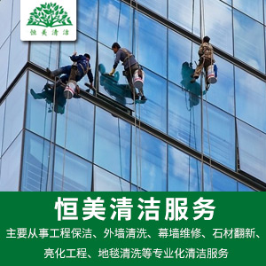 公司擁有各類專業(yè)化管理人員,主要從事工程保潔、外墻清洗、幕墻維修、石材翻新、亮化工程、地毯清洗等專業(yè)化清潔服務(wù)。